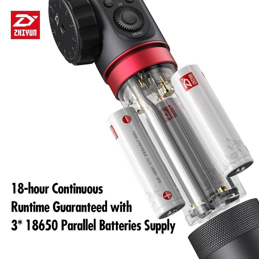 For improved energy efficiency, the 3-axis gimbal has three rechargeable 18650 batteries that deliver a total 6000mAh capacity for up to 18 hours of continuous use when balanced correctly. The increased power capacity provides peace of mind while shooting weddings or other extended events allowing you to undertake more extensive film projects with confidence.